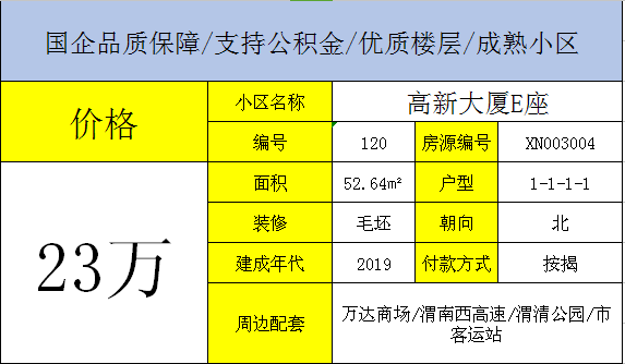 房屋信息:朝阳大街与王良路十字向东路南/渭河房地产五证齐准现房/已封顶共24层,1室1厅1卫,现房可按揭,可办公积金
