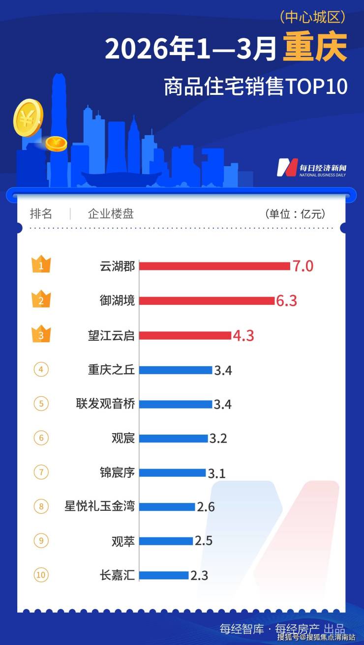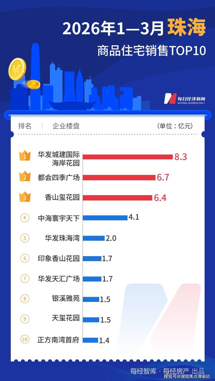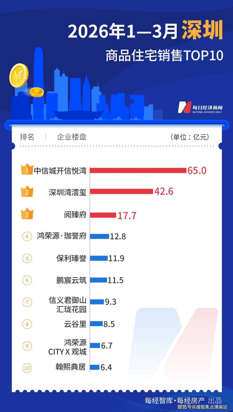2026年1月—3月,深圳中信城开信悦湾、深圳湾沄玺、阅臻府三个项目分别贡献约65亿元、42.6亿元、17.7亿元销售额,累计销售超10亿元的项目数量达到6个。中信城开信悦湾也成为全国十大热点城市中的“销冠”项目。