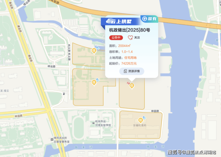 杭政储出[2025]80号即拱墅区原运河新城单元GS1004-09-2地块,东至规划支路二,南至祥园路,西至规划支路七,北至规划支路二。地块出让面积20044平方米,出让建筑面积28061.6平方米,出让起始价74226万元,折合起始楼面价约2.65元/平方米。