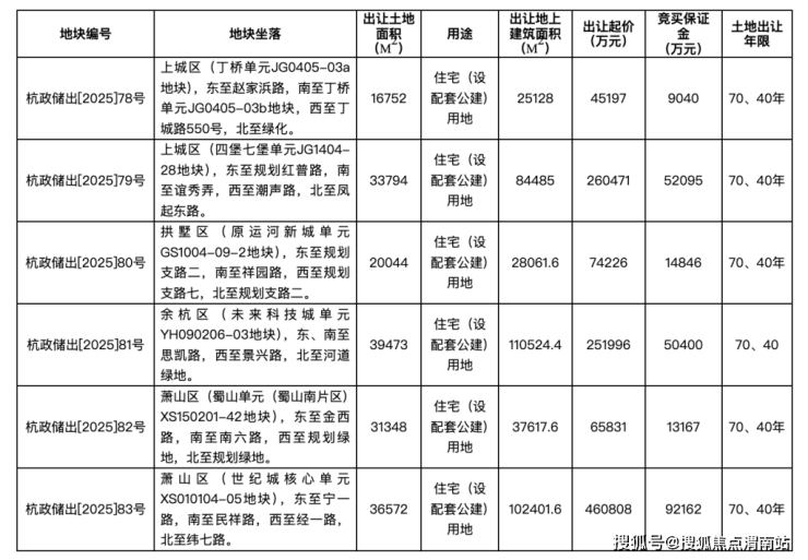 6宗地块中,起始总价及起始楼面价最高的地块为杭政储出[2025]83号地块,即萧山区世纪城核心单元XS010104-05地块,该地块东至宁一路,南至民祥路,西至经一路,北至纬七路。地块出让面积36572平方米,出让建筑面积102401.6平方米,出让起始价460808万元,折合起始楼面价4.5万元/平方米。