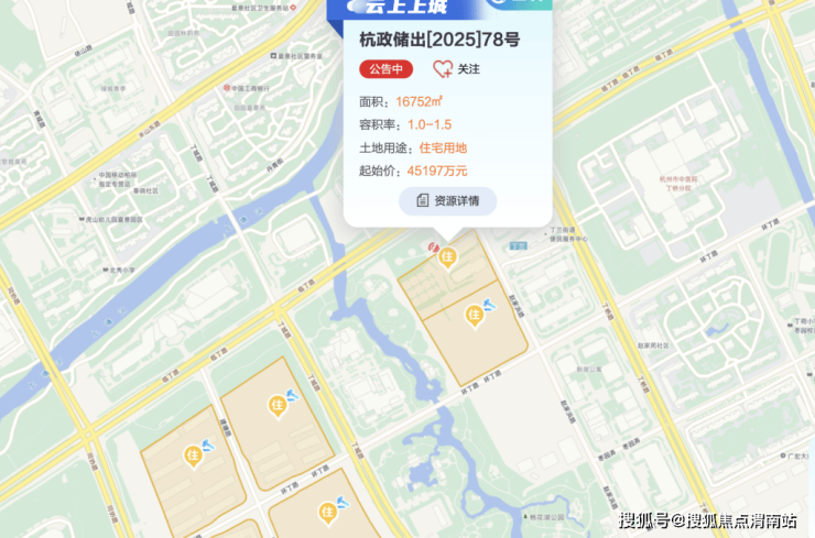 此外,上城区丁桥单元地块也受到关注。杭政储出[2025]78号即上城区丁桥单元JG0405-03a地块,东至赵家浜路,南至丁桥单元JG0405-03b地块,西至丁城路550号,北至绿化。地块出让面积16752平方米,出让建筑面积25128平方米,出让起始价45197万元,折合起始楼面价约1.8万元/平方米。该地块距离3号线桃花湖公园站约700米,周边配套齐全。