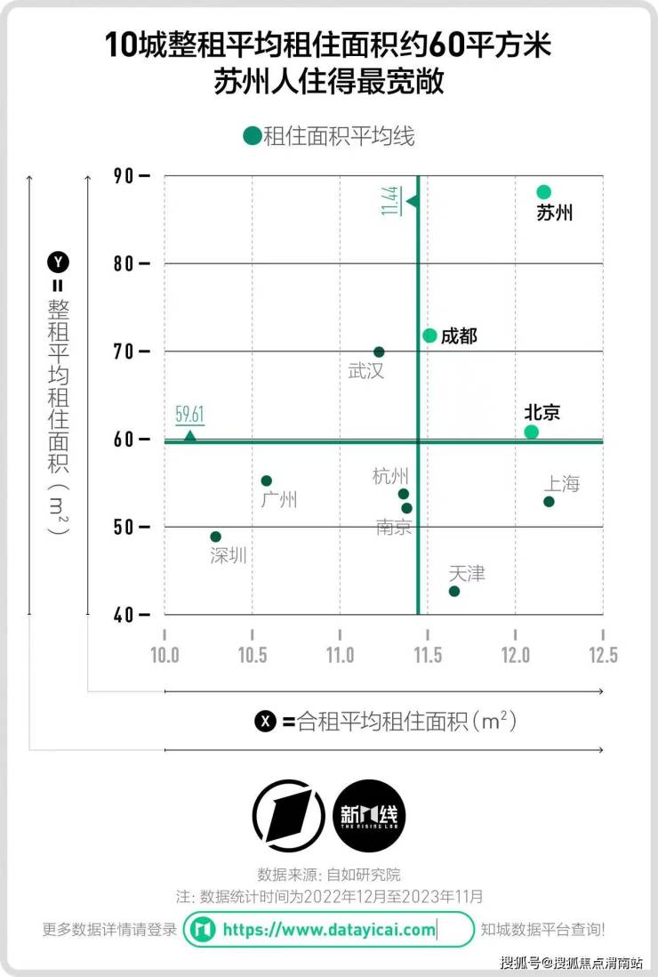 从平均租住面积来看,10城整租平均租住面积约60平方米,合租平均租住面积普遍在10至13平方米之间。整租中,苏州租客住得最宽敞,平均租住面积达到了88.12平方米。其次是成都、武汉,整租平均租住面积均在70平方米左右。