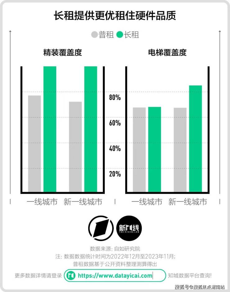 相比普租,长租机构在精装和电梯等硬件品质上,提供了显著更优的选择:自如在10座城市长租房源的精装率接近100%,较普租高出27个百分点;此外,10座城市普租房源的电梯覆盖率大约为67%,自如房源的这一比例达到79%。