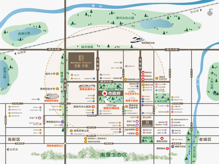 随着渭南城市规划运作,文化艺术中心、博物馆、体育中心、大剧院等坐落于市政新区,宝能华府择址该区域,周边商业配套成熟,近距离吾悦广场、万达广场、红星美凯龙商圈、并自带商业等;项目南边仅5分钟车程即可到达“三级甲等”综合性医院——渭南市中心医院,居住于此,生活配套设施齐全,居民生活更加安逸。