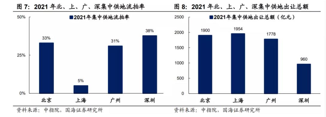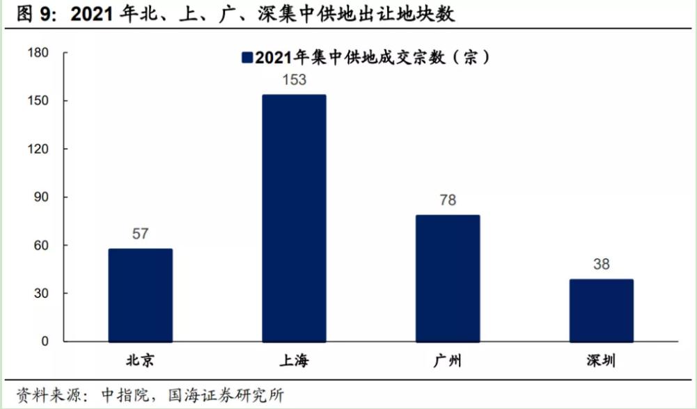 中指院数据显示,一线城市中,上海的土地市场热度较高。2021年全年三轮集中供地,北京、上海、广州、深圳流拍率分别为33%、5%、31%和38%,分别成功出让57、153、78、38宗地块,总出让金额分别为1900、1954、1778和960亿元。在一线城市中,上海土拍流拍率较低,成交地块最多,出让金额较高。
