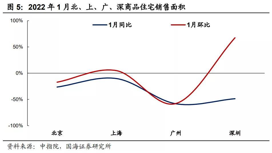 值得注意的是,2022年开年,一线城市中的上海、深圳的房地产市场率先升温。中指院数据显示,2022年1月,北京、上海、广州、深圳的商品住宅成交面积同比分别为-26.4%、-10.2%、-58.2%和-48.7%,环比分别为-17.2%、4.9%、-57.9%和67.4%。上海和深圳环比实现增长,表明两地市场正逐步修复2021年四季度以来市场逐渐下行的态势,但深圳市场较2021年同期仍有明显降幅。