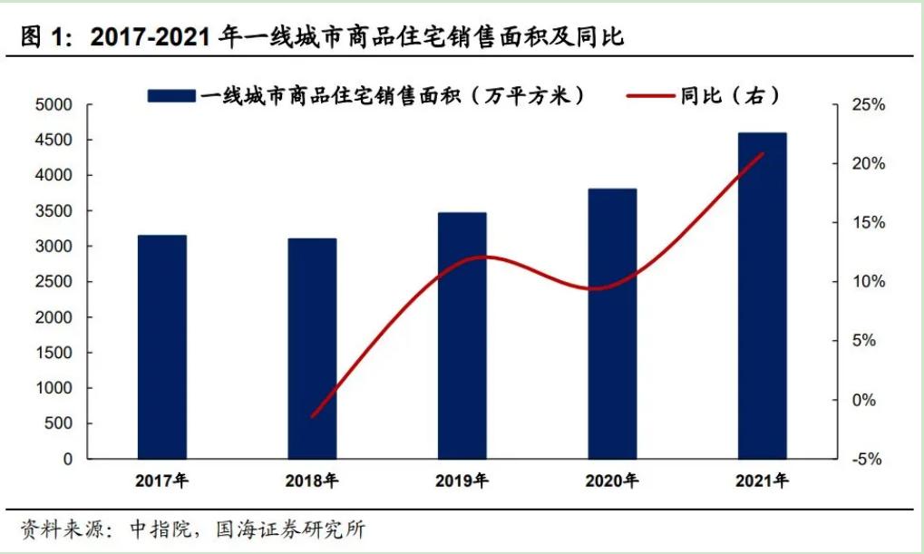 中指院数据显示,2021年,一线城市的商品住宅销售面积为4590.8万平方米,同比增长20.8%,保持了高位增长。北京、上海、广州、深圳的商品住宅销售面积分别为1036.6、1800.7、1267.6、485.95万平方米,均创下五年新高。