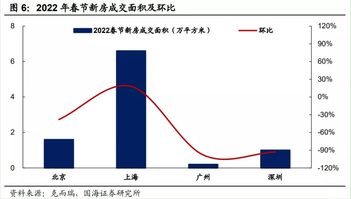 春节期间,上海的楼市继续升温。1月31日至2月6日,从新房成交面积来看,北京、上海、广州、深圳四地分别成交1.6、6.6、0.2、1万平方米,仅有上海实现了环比正增长,且上海商品住宅成交面积较2021年春节同期增长了649.3%。