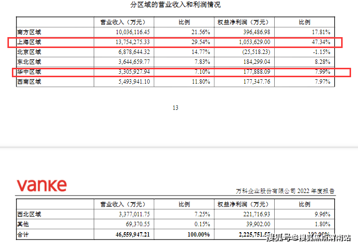 华中区域是万科系统里面较为稳健的区域之一。搜狐财经查询年报发现,2021年年报中其权益净利润占到10.13%%,彼时占比最高的为上海区域,为35.42%。该项数字在2022年下滑至7.99%,当时占比最高的上海权益净利润达到47.34%。