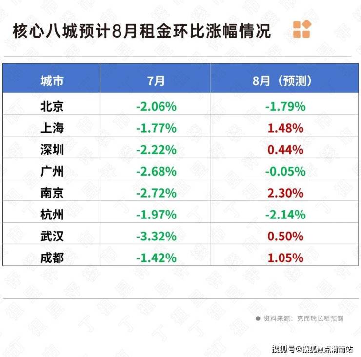 根据以往经验来看,随着市场转入传统租赁淡季,重点八城租金走势整体仍以下调为主,8月环比降幅预计在3%以内,上海、深圳、南京、武汉和成都租金同比或迎来上涨,但整体涨幅有限。