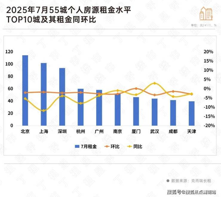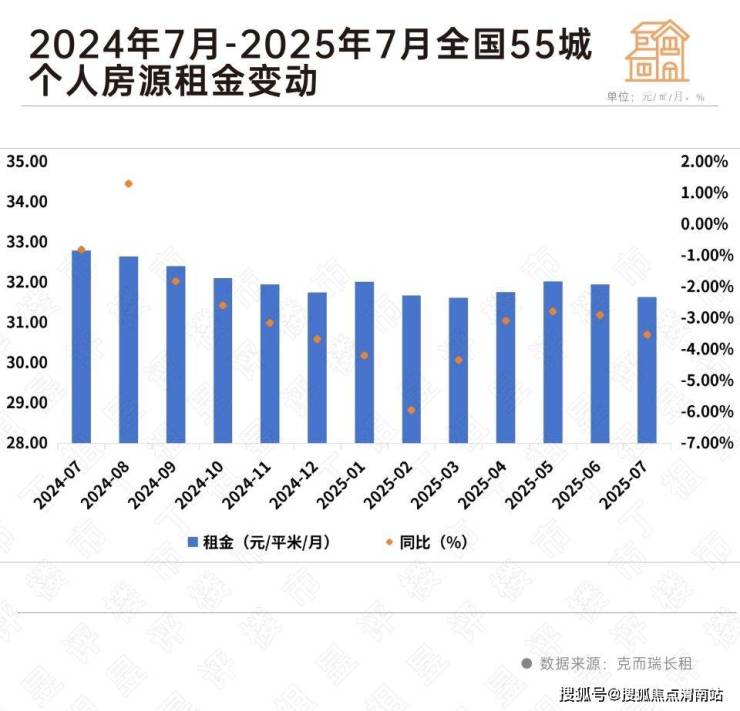 克而瑞长租数据显示,55城个人房源挂牌租金在7月环比下降3.52%至31.65元/㎡/月,尚不及去年同期租金水平。