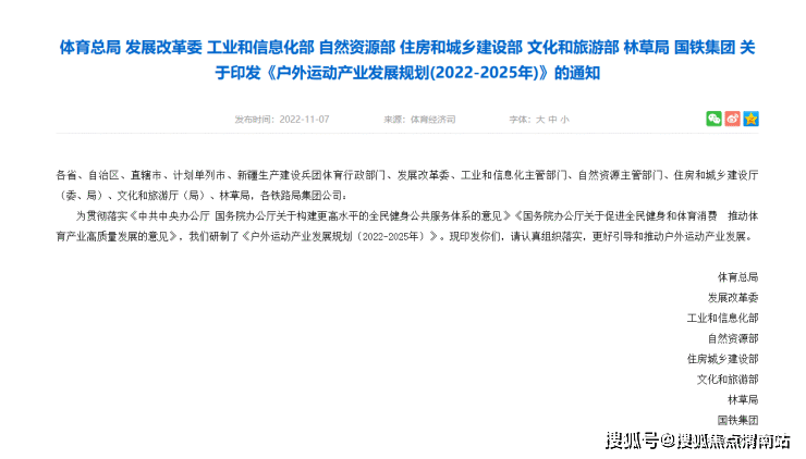 央广网北京11月9日消息 据国家体育总局网站消息,近日,国家体育总局、国家发展改革委、住房和城乡建设部等八部门共同印发《户外运动产业发展规划(2022~2025年)》(以下简称《规划》)。