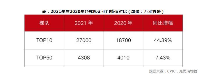 克而瑞物管数据系统CPIC监测显示,2021年,物管企业的TOP10门槛值大幅提升,企业要进入行业发展前十名,在管面积值要达到2.70亿平方米以上,这与2020年的数值相比,TOP10门槛提升8300万平方米,增幅为44.39%。