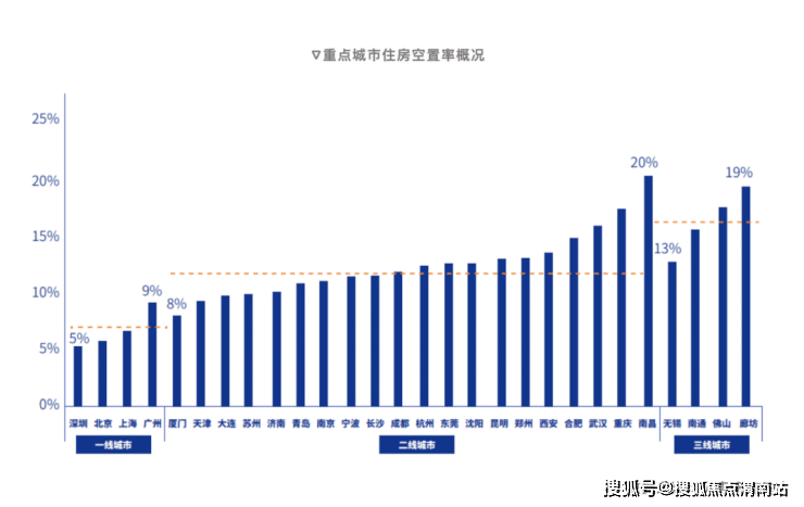 住房空置率随城市能级依次递增,一线城市平均7%,二线平均12%,三线16%。其中仅有9个城市空置率处于合理区间之内,大部分城市处于10%-15%之间,6个城市高于15%。
