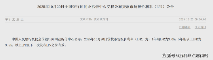 中房网讯(刘敏/文)10月20日,中国人民银行授权全国银行间同业拆借中心公布,2025年10月20日贷款市场报价利率(LPR)为:1年期LPR为3.0%,5年期以上LPR为3.5%。以上LPR在下一次发布LP…