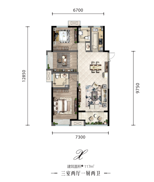 约94㎡户型为两室两厅一卫,约117㎡户型为三室两厅两卫,约127㎡户型为三室两厅两卫,户型设计贴合生活所需,户型较为方正,全明采光,无暗卫暗厨设计。