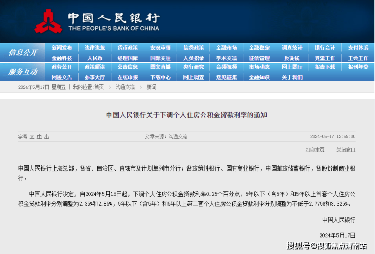 中国人民银行决定,自2024年5月18日起,下调个人住房公积金贷款利率0.25个百分点,5年以下(含5年)和5年以上首套个人住房公积金贷款利率分别调整为2.35%和2.85%,5年以下(含5年)和5年以上第二套个人住房公积金贷款利率分别调整为不低于2.775%和3.325%。