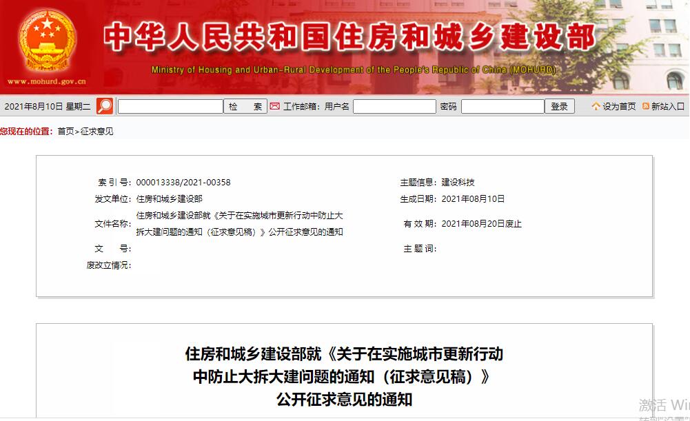 8月10日,住建部发布通知,就《关于在实施城市更新行动中防止大拆大建问题的通知(征求意见稿)》(以下简称“意见稿”)公开征求意见,征求意见截止时间是8月20日。