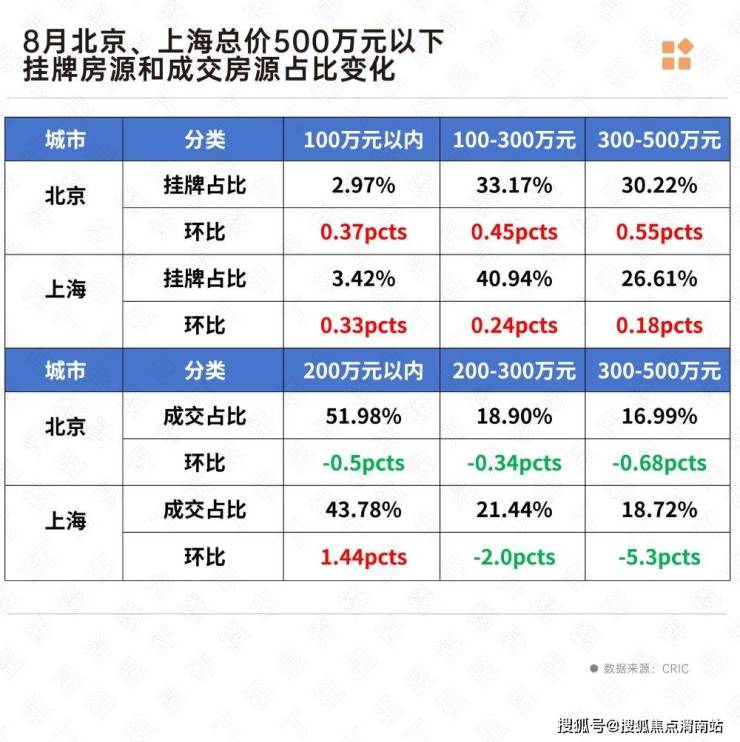 而对应该总价段成交端占比变化却在大幅下滑,北京300-400万成交环比下降了0.96个百分点,总价400-500万成交略有上升。
