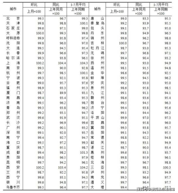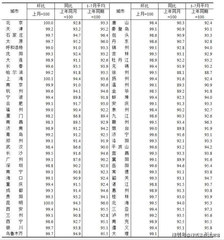 同比方面,7月份,一线城市新建商品住宅销售价格同比下降4.2%,降幅比上月扩大0.5个百分点。其中,北京、广州和深圳分别下降3.3%、9.9%和8.0%,上海上涨4.4%。二、三线城市新建商品住宅销售价格同比分别下降4.8%和5.8%,降幅比上月分别扩大0.3个和0.4个百分点。