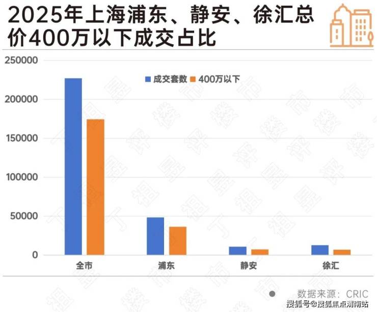 数据显示,2025年上海二手房成交套数约227123套,其中总价400万以下成交占比达76.71%,浦东、静安、徐汇三区总价400万以下的成交占比都在50%以上,其中浦东达75.32%,静安达66.24%。