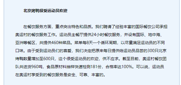 里面所包含的食物应有尽有,可以满足来自全世界各地人的口味,并且菜单还是每八天就要循环一次,里面更是有北京特色烤鸭供人免费食用。