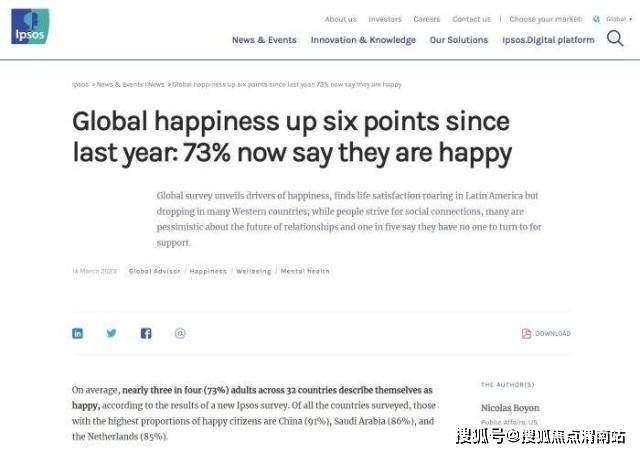 调查结果显示,平均而言,在32个国家中,近四分之三(73%)的成年人认为自己很幸福。在所有接受调查的国家中,幸福感指数最高的国家是中国(91%),其后是沙特阿拉伯(86%)、荷兰(85%)、印度(84%)、巴西(83%)。