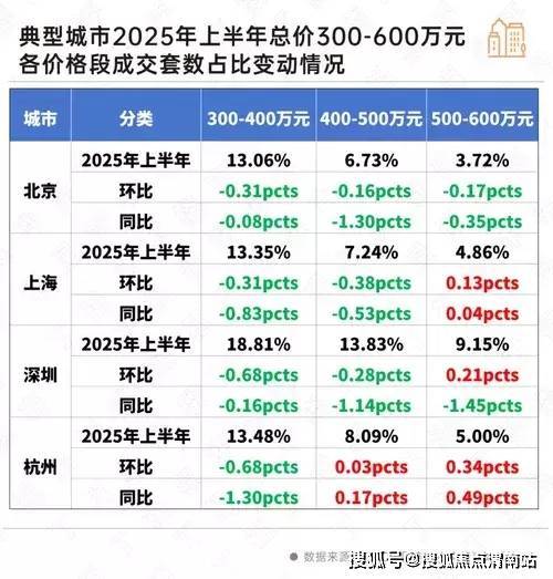 相比之下,刚改客群观望情绪持续加剧,同时部分刚改客群转移至新房市场,总价段300-600万成交占比显著回调。以北京为例,三个总价段300-400万元、400-500万元、500-600万元2025年上半年成交占比同环比齐跌,全面飘绿。