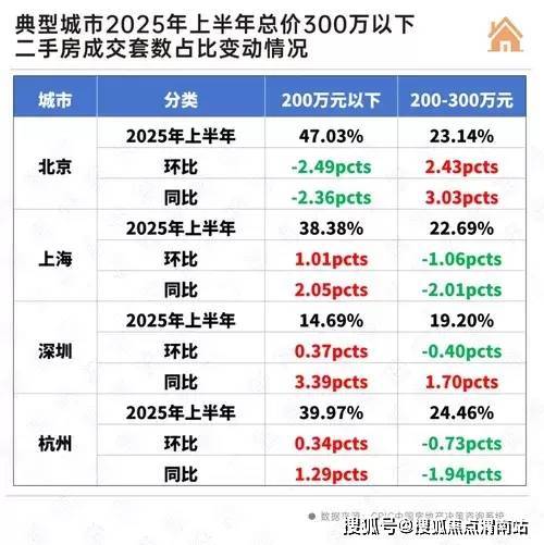 不过,上海、深圳和杭州总价200万元以下二手房成交套数占比仍在上涨,极致刚需客群面临较为严重的消费降级。其中深圳较为明显,2025年上半年深圳总价200万以内房源成交套数占比为14.69%,环比上升0.37个百分点,同比涨幅最高,达到了3.39个百分点,刚需市场份额有进一步扩大趋势。