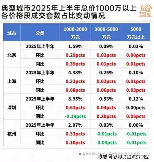 以上海为例,总价超1000万二手高端住宅2025年上半年成交套数占比不足5%,但整体同环比齐增,其中1000-3000万增幅最为显著,同环比分别上升0.68个百分点和0.33个百分点。