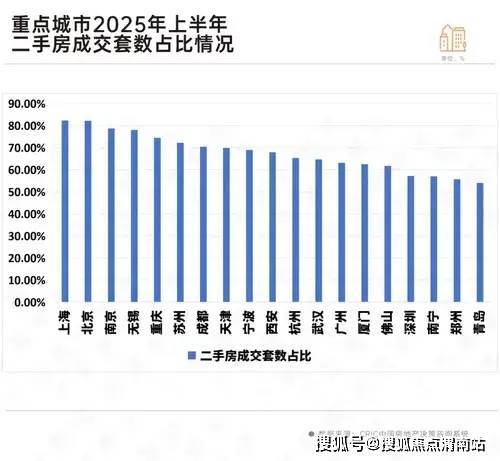 南京、无锡、重庆、苏州和成都上半年二手房成交套数占比均在七成以上。