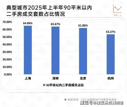 其中,2025年上半年上海90平米以内的二手房成交占比达到了64.86%,深圳90平米以内二手房成交的比重仅次于上海,达到了63.67%,北京也在六成以上,为61.86%。
