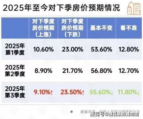 2025年第三季度,中国人民银行在全国50个城市进行了2万户城镇储户问卷调查,结果显示:对下季房价,9.1%的居民预期“上涨”,55.6%的居民预期“基本不变”,23.5%的居民预期“下降”,11.8%的居民“看不准”。