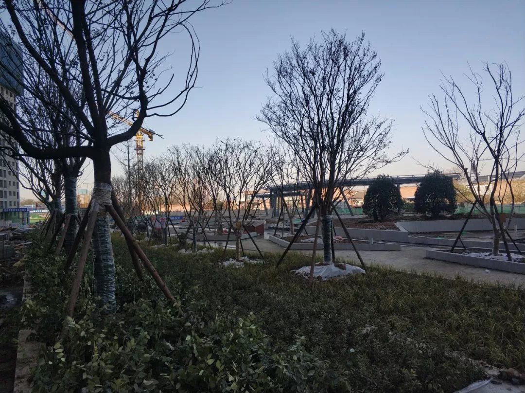 苗木种植完成60%;石材铺贴完成50%;水景施工完成70%;管网施工完成90%;天然气工程完成70%。