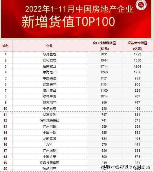 华润置地、保利发展新增货值居前两名