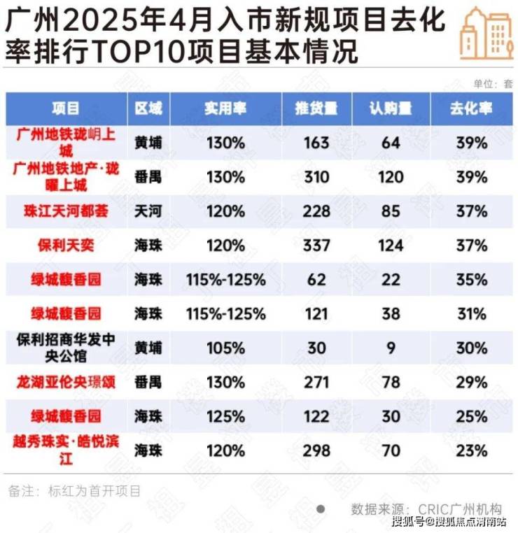 以广州为例,4月全市共有13个新规产品入市,推货量占全市六成,热销去化项目多为首开新盘,产品实用率多超120%,支撑市场去化热度环比持增8pcts至23%。