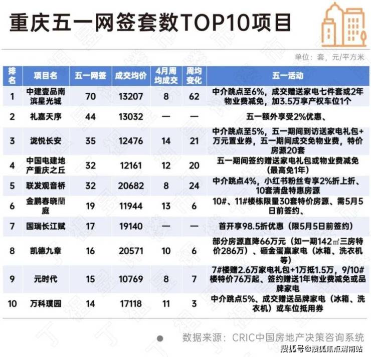 重庆热销项目普遍依靠中介跳点,特价房源及多项成交大礼包推动成交,市场反馈积极,TOP10项目均实现周均成交的大幅上涨。