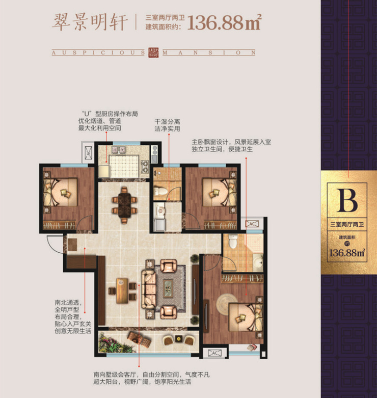 汇邦·沋河瑞府3室2厅2卫136.88㎡,总整体来看功能齐全,南北通透,布局合理。南向超大会客厅及阳台属于改善型户型标配,可满足家庭聚会、朋友到访等各项需求。另外,U型厨房设计符合人们生活习惯,干湿分离卫生间更是健康舒适。