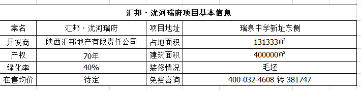 汇邦·沋河瑞府位于瑞泉中学新址东侧,由陕西汇邦地产有限责任公司开发建设,占地面积131333㎡,建筑面积400000㎡。