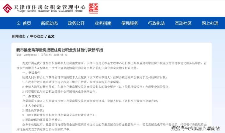天津市推出购存量房提取住房公积金支付首付款新举措