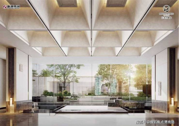 新洲·光合麓院以南京涵碧楼、青普文化行馆等顶级酒店为灵感蓝本,提炼出“气质、艺术、度假、自然”四重设计维度,从门头到院落,每一处细节都遵循“藏风聚气”的东方格局:项目主入口采用“门头内高外低”的格局,五步台阶寓意“连升五级”,配合宇宙黑奢石与水景琉璃幕墙,夜幕降临时,灯光流淌如星河,将归家仪式升华为艺术观览。次入口借鉴酒店车马前厅概念,通过人车分流设计与叠涩内凹门头,营造港湾般的归属感,细节中处处彰显“隐奢”质感。