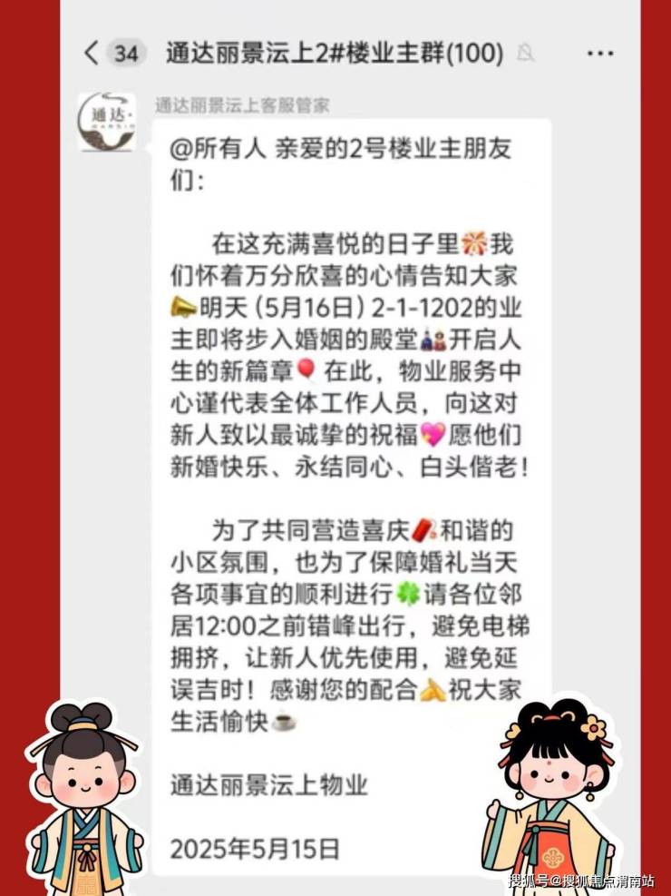 在婚礼前夕,物业将服务的触角延伸到每一个角落。保洁人员对小区大门口、一楼大堂以及电梯轿厢进行深度清洁,让每一处都纤尘不染,以整洁优雅的环境迎接宾客。夜班保安则加强巡查频次,严密守护小区的安全与秩序,为婚礼的顺利举行保驾护航。同时,物业还在业主群发布温馨提示,告知婚礼相关事宜,提醒业主合理安排出行,尽量错开婚礼高峰期,确保婚礼现场交通顺畅。