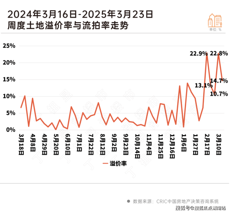 表现在数据层面,根据CRIC监测的重点城市周度数据来看,在一二线城市高溢价地块的带动下,第12周(3月17日-3月23日)平均溢价率升至14.7%,且已连续5周都在10%以上。
