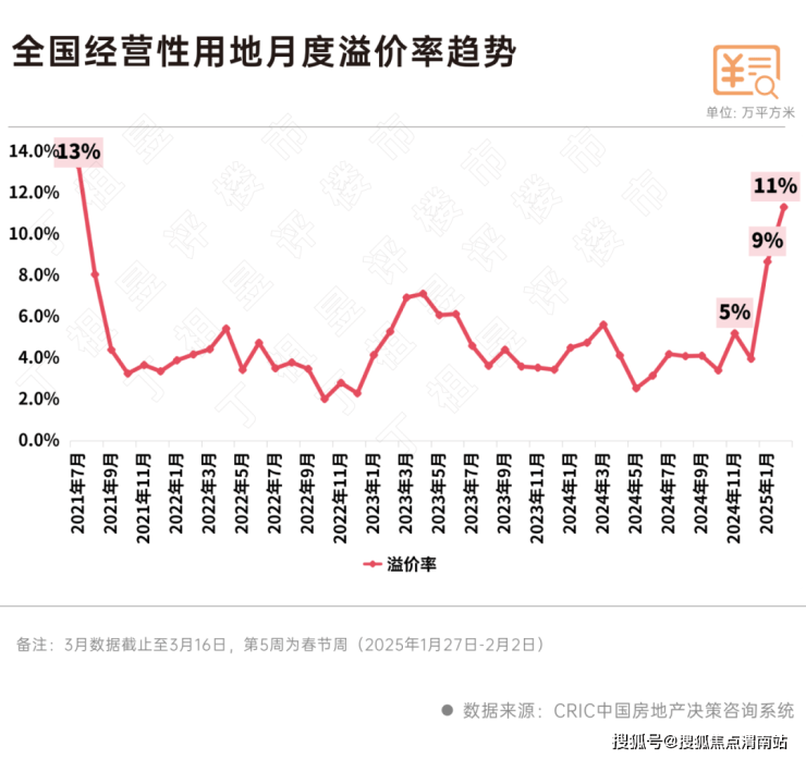 从月度数据来看,2025年2月经营性用地平均溢价率达到11%,这是自2021年下半年进入调整期之后,平均溢价率首次突破10%,上一次突破10%还是在2021年7月。