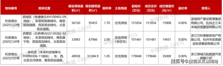 本次出让地块中,成交总价和单价最高的均为余杭区未来科技城单元YH090306-11地块。绿城中国(03900.HK)旗下的浙江绿城元和旅游开发有限公司以17.98亿元的底价竞得,成交楼板价35000元/平方米。