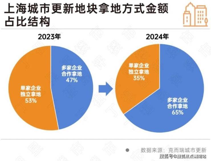 当前房地产市场持续承压,商办资产自持比例攀升、住宅开发利润空间收窄,房企减负转型势在必行。在此背景下,城市更新领域的合作模式加速深化,联合拿地渐成主流。随着专业分工持续细化,多家房企联合获取项目日益普遍,通过股权转让引入战略合作伙伴的模式也日趋成熟。以上海为例,城市更新合作拿地金额占比已从2023年的47%跃升至2024年的65%。