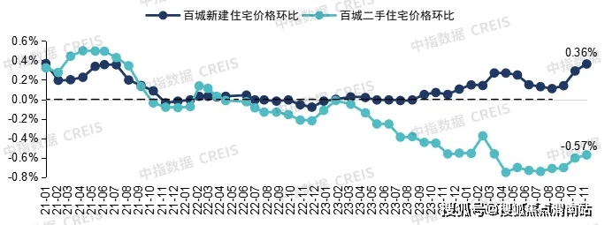 (2021年以来百城新建住宅、二手住宅价格环比变化。来源:中指研究院)