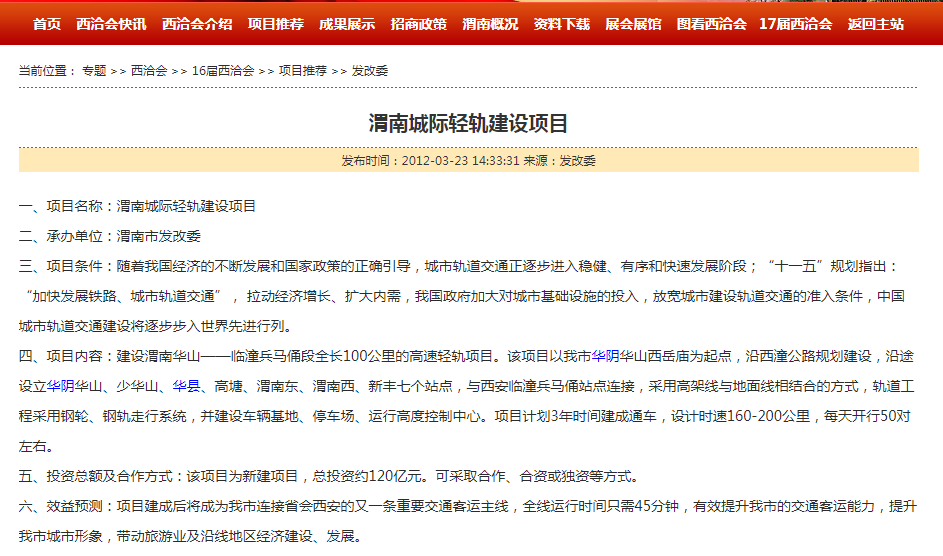 2012年第十六届西洽会上,推荐项目中包含了由渭南市发改委承办的渭南城际轻轨项目。