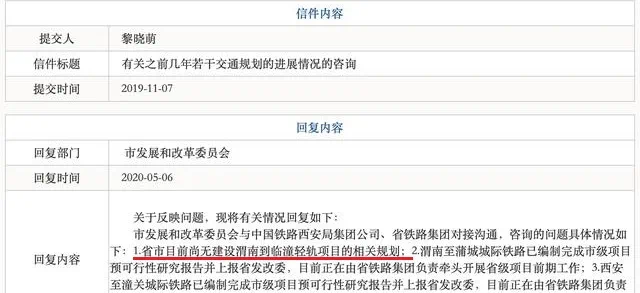 其中明确表示市发展和改革委员会与中国铁路西安局集团公司、省铁路集团对接沟通省市且前尚无建设渭南到临潼轻轨项目的相关规划,还提到了渭南至蒲城城际铁路、西安至潼关城际铁路,已编制完成市级项目预可行性研究报告,并上报省发改委,目前正在由省铁路集团负责牵头,开展省级项目前期工作,渭南东站目前尚无相关建设规划,希望渭南发展越来越好。