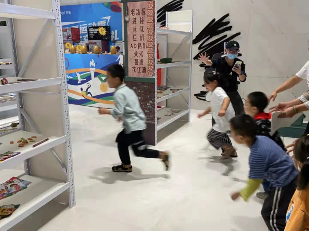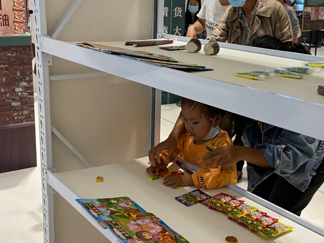 小卖铺里各式货品,从大大泡泡糖、大白兔奶糖、跳跳糖、果丹皮、五彩绳软糖等小零食,到九连环、华容道、游戏机、悠悠球、鸡毛毽子、四驱车、沙包等回忆杀小玩具,再到儿童绘本、小人书、科普系列等书籍一应俱全,让所有大朋友们欣喜不已,激动地向小朋友们介绍一应货品,讲述其背后属于自己的青春故事。